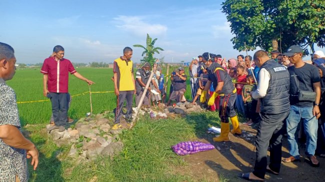 GOWA,REWAKO.ID , Warga Bontobila, Lingkungan Ujung Bulo, Kelurahan Lembang Parang, Kecamatan Barombong, Gowa, dihebohkan dengan penemuan sesosok mayat bayi yang terapung di irigasi persawahan, Jumat (7/6/2024).